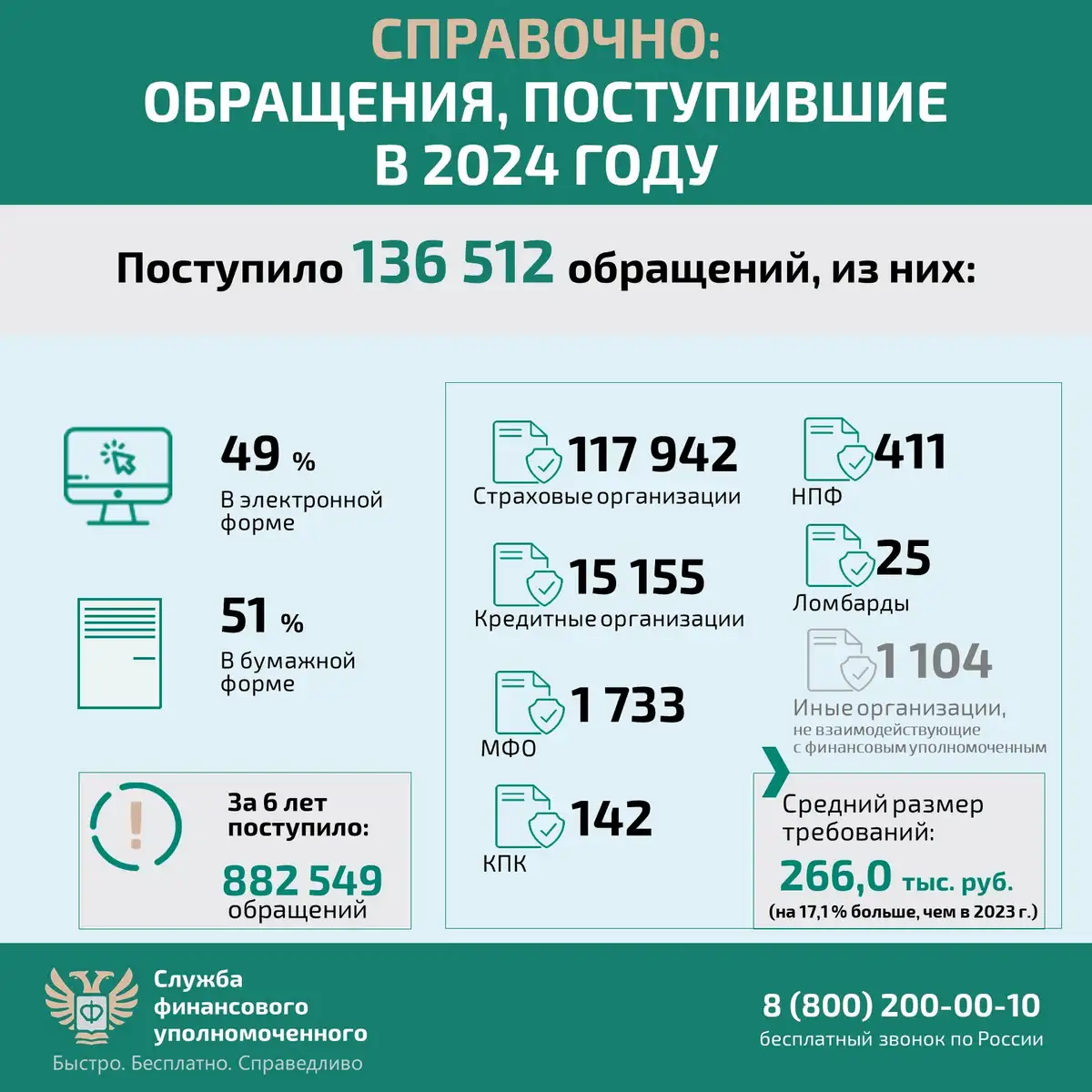 В 2024 году в Службу финансового уполномоченного поступило 1 733 обращения по спорам с 172 микрофинансовыми организациями. Средний размер требований потребителей по спорам с МФО в 2024 году составил 28 тыс. рублей.